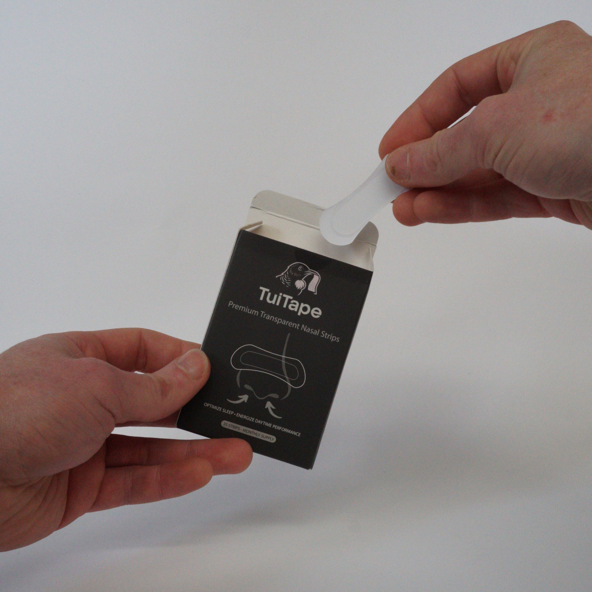 - Peel & Position: Gently bend the strip backwards to remove the backing paper from the middle, then centre it across the bridge of your nose.